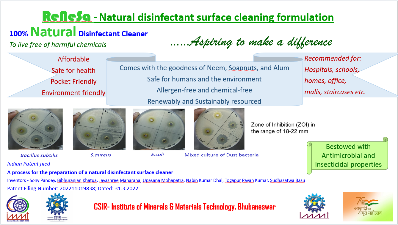 | Executive summary of the proposed project (In 250 words) | The need of cheap and abundantly available antimicrobial cleaning solutions was underlined by the pandemic, but it will continue to remain of great importance to clean frequently touched/used surfaces for all times to come. There are a variety of cleaning solutions available in the market that can be used for this purpose but they are costly and toxic to the human and environment. Here we present an easy method of preparing a natural antimicrobial solution which can effectively clean any surface including the floor, with raw materials that are inexpensive and abundantly available. The simple natural ingredients like lemongrass or neem etc. used in a specific proportion, method and combinations produces powerful antimicrobial action. This is an environment friendly and skin safe option for disinfection of indoor places like doors and windows, handles, working tables, chairs, lobbies, corridors, staircase railing, escalators, elevator, offices, hospitals, public service booths etc. which is required to be cleaned on a regular basis. Antimicrobial tests have been carried out extensively against gram negative and gram positive bacteria and mixed culture of bacteria from dust and air by agar well diffusion method and surface swab test method, and significant reduction of bacteria was found on the surfaces. The formulation is extremely effective disinfectant, in comparison with the currently available popular brands of chemical and herbal disinfectant surface cleaners in the market. It works well with dilutions up to 250 times and the results show that this formulation works at par with the commercially available brands. |