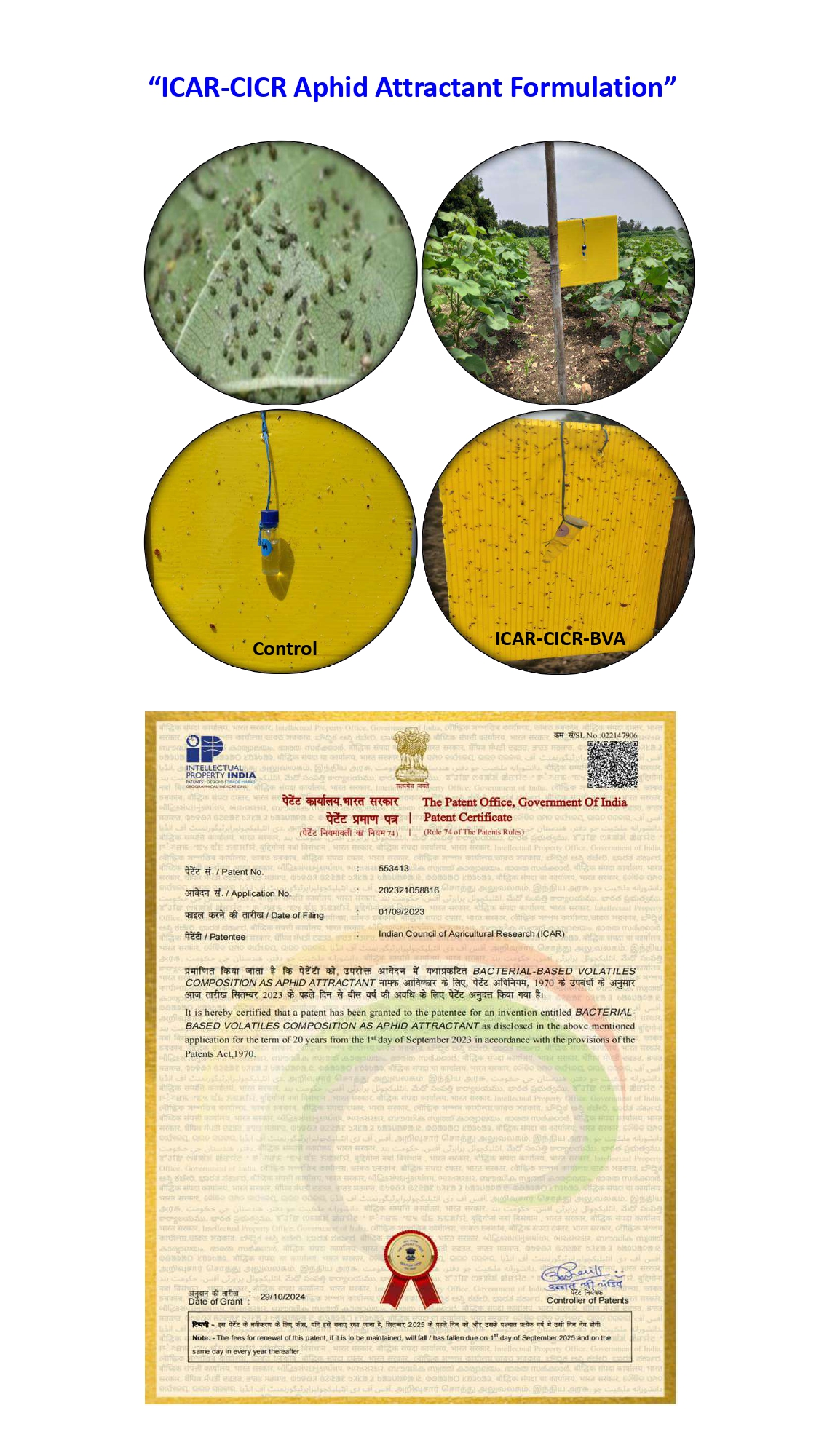 | Executive summary of the proposed project (In 250 words) | Sucking pests (SP) cause significant yield and quality losses in cotton. Farmers largely depend on conventional insecticide groups to manage these pests, which, upon continuous use, result in pest resistance to insecticides, resurgence of minor pests, decline of natural enemies, and environmental pollution. Although yellow sticky traps (YSTs) have been popularly used as mechanical control options for SP management, further enhancements in pest attraction to YSTs will be useful. In this present situation, an alternative ecofriendly and cost-effective SP management approach is necessary. ICAR-CICR has developed bacterial-based attractant formulations, which, on a three-year large-scale multi-location evaluation, proved to manage sucking pests of cotton through their attraction toward YST. The attractant formulations ICAR-CICR-BVW, ICAR-CICR-BVJ, ICAR-CICR-BVA, and ICAR-CICR-BVT recorded attraction efficiencies of 168%, 197%, 189%, and 175% over control (only YST) for whiteflies, jassids, aphids, and thrips, respectively. Further, a novel bacterial-based attractant formulation that enhances the attraction of beneficial insects to cotton fields by 268% was developed. The attractant is eco-friendly and cost-effective, does not cause any harmful effects on cotton plants, soil nutrient status, and soil biology, and can reduce chemical usage and pest resurgence in cotton. ICAR-CICR received four patents for these attractant formulations [whitefly (541777), aphids (553413), thrips (554409), and beneficial insects (546146)], and technology proposal has been submitted to Agrinnovate for commercialization). In the era of the promotion of non-chemical agriculture, the applicability of attractant formulations in agriculture has great potential to reduce cultivation cost and environmental protection. Nevertheless, these attractant technologies must reach farmers. |