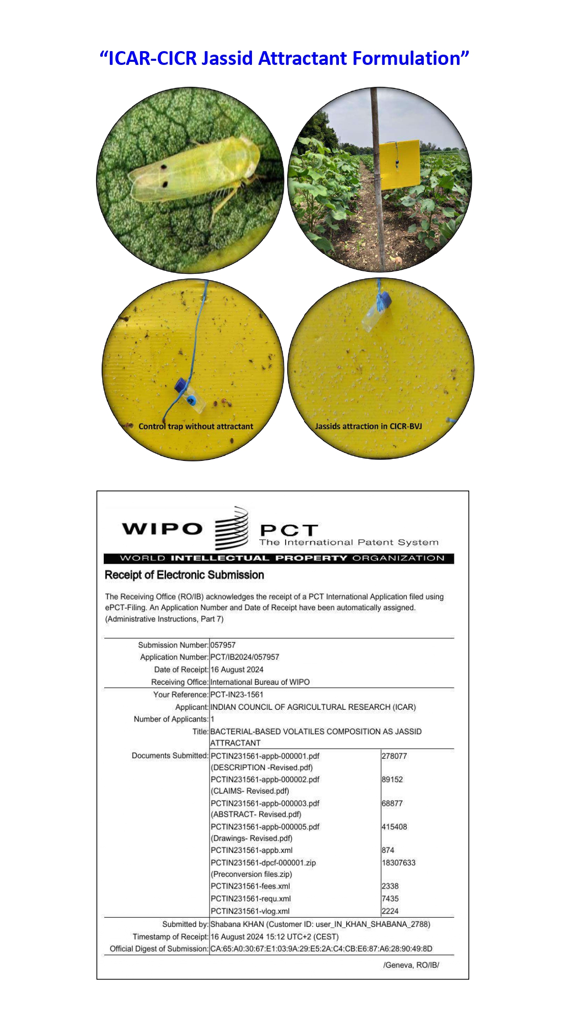 | Objective on the basis of need | The primary objective of this product/technology is to popularize (Technology transfer) the use bacterial-based volatile attractant formulations for sucking pest management in cotton among farmers |