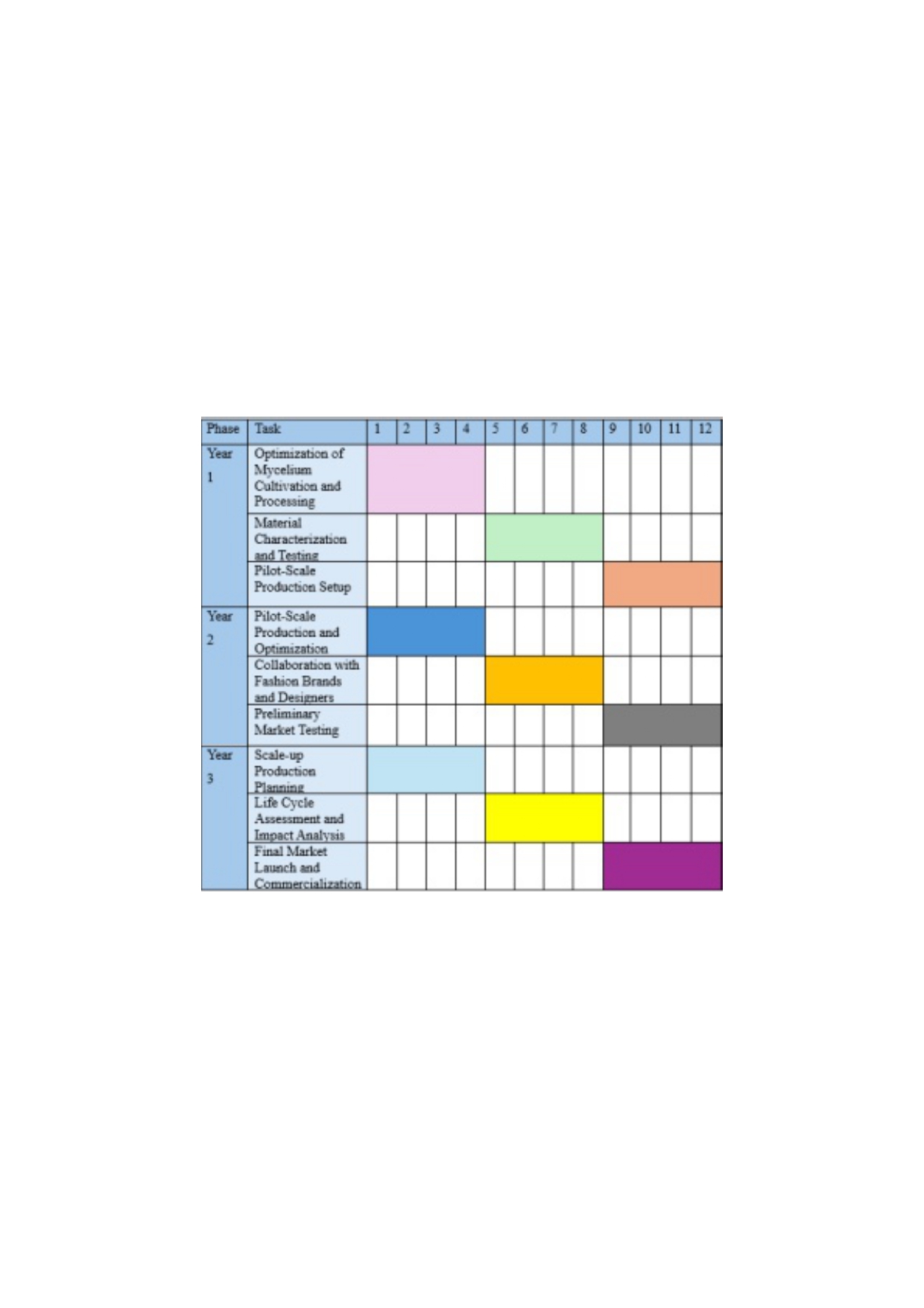 | Implementation model (self- implemented/ outsourced partnership) | The implementation model for this proposal will adopt a phased approach, ensuring efficient resource allocation and progress tracking. The initial phase will prioritize research and development, focusing on optimizing mycelium cultivation and processing techniques to achieve desired material properties. The second phase will involve pilot-scale production, validating the scalability and economic viability of the process. The final phase will focus on commercialization, including collaborations with fashion brands, market testing, and impact assessment. The project will be managed by a dedicated team with expertise in mycology, materials science, and business development. Regular monitoring and evaluation will ensure the project stays on track and delivers tangible outcomes. The phased approach, combined with effective project management, will maximize the chances of success and ensure the timely realization of the project's vision for a sustainable fashion industry. |