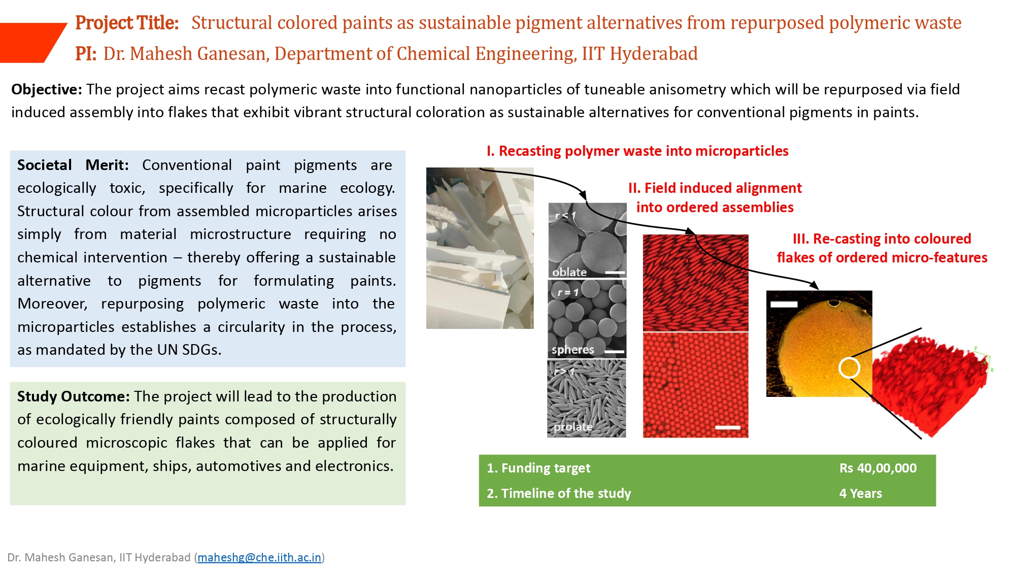 | Objective on the basis of need | The project aims to recast polymeric waste into functional nanoparticles of tuneable anisometry which will be repurposed via field induced assembly into flakes that exhibit vibrant structural coloration as sustainable alternatives for conventional pigments in paints. |