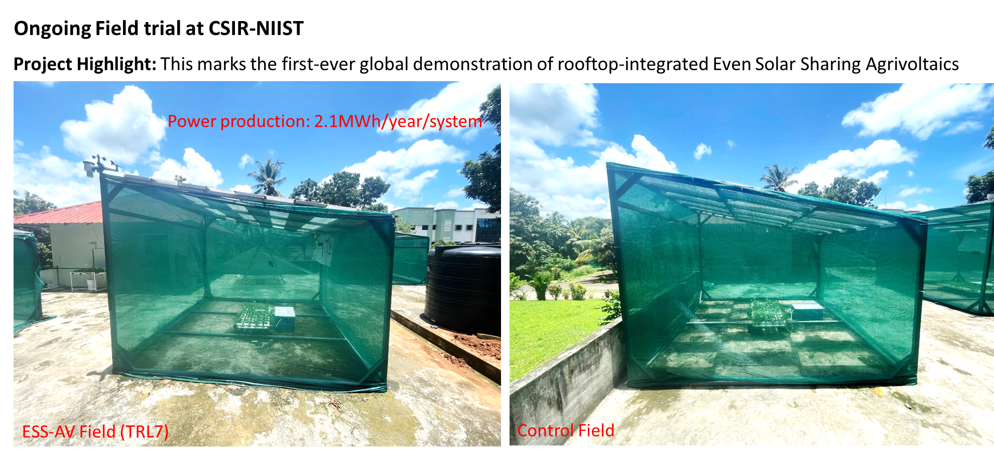 | Executive summary of the proposed project (In 250 words) | This pioneering project endeavors to revolutionize the agricultural sector by integrating cutting-edge solar energy technologies with enhancements in both agricultural and livestock productivity. By deploying Solar Sharing Agrivoltaics (SS-AV) and Radiative Cooling-integrated Photovoltaics (RC-PV) cool roofs, the initiative seeks to significantly boost energy efficiency, increase crop yields, and improve animal welfare. Aligned with India's goals to double farmers' income and advance carbon-neutral farming, as well as the United Nations Sustainable Development Goals (SDGs), this project offers a comprehensive and forwardthinking approach to sustainable agriculture. The SS-AV technology, developed by CSIR-NIIST and currently at Technology Readiness Level (TRL) 7, incorporates advanced optical solutions such as tunable ray spreading and spectral conversion. These innovations are designed to adapt to a variety of crop heights and Photosynthetic Photon Flux Density (PPFD) requirements, thereby enhancing photovoltaic coverage and energy production while simultaneously reducing water evaporation and heat stress on crops. In parallel, climate change poses a significant challenge to livestock productivity by exacerbating heat stress (HS). Addressing this issue, the development and deployment of RC-PV cool roof technology, currently at TRL 3, aims to reduce heat stress in livestock. This is achieved by creating a cooler environment through the innovative use of radiative cooling, which leverages the cold sink of outer space. This technological integration not only alleviates thermal stress on both photovoltaic systems and animals but also enhances electricity generation, thereby contributing to a more sustainable energy ecosystem. By implementing these advanced SS-AV and RC-PV cool roof solutions, the project aims to set a global benchmark for carbon-neutral farming, establishing new standards for performance and sustainability and offering a model replicable for future agricultural innovations worldwide. |